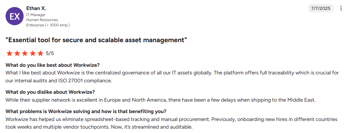 If you don’t have time to test every tool, start with Workwize—it’s a proven, end-to-end ITAM platform that helps organizations automate, save money, and eliminate spreadsheet chaos.