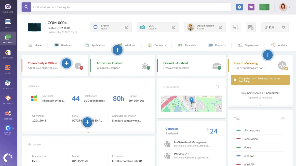 Based on the demo, the tool’s interface is simple (a bit outdated, though), and everything, from asset details and reports to CMBD, software, and contracts, is available on the same dashboard.