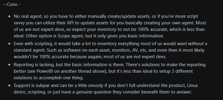 While several users on Reddit love Snipe-IT for it’s open source and free nature, it has several shortcomings:
