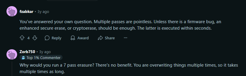 While multi-pass overwrite looks more promising, several Reddit users believe it’s an overkill and one pass is good enough: