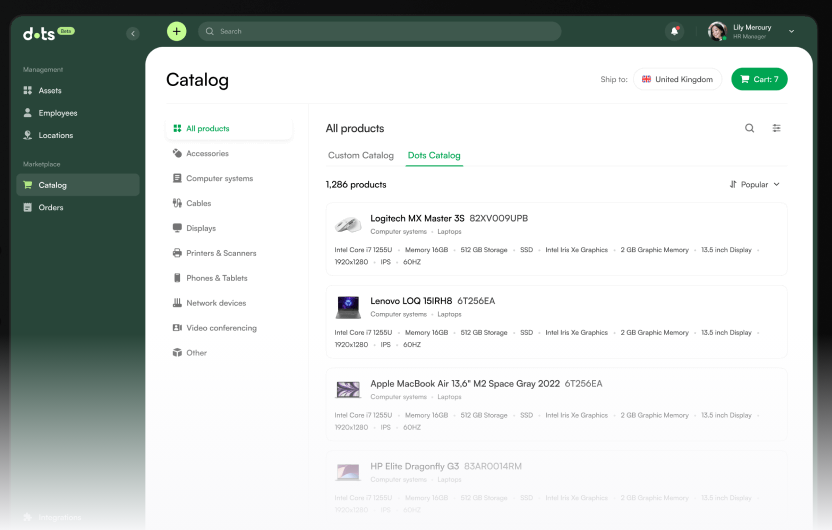 Dotstech simplifies the process of purchasing IT hardware. Through a multi-vendor procurement platform, Dots can automatically source quotes for laptops, monitors, peripherals, etc., and find the best deal for you.
