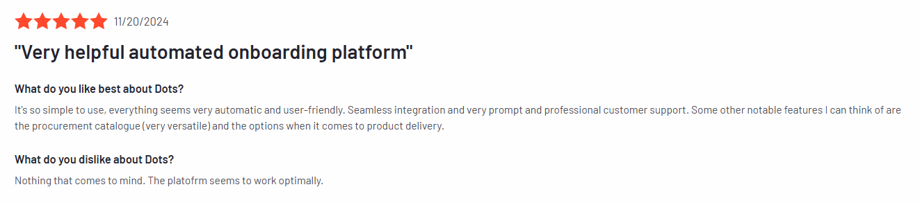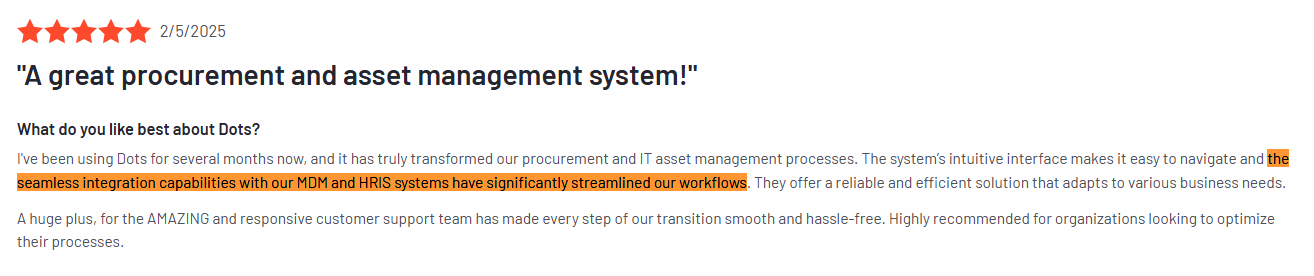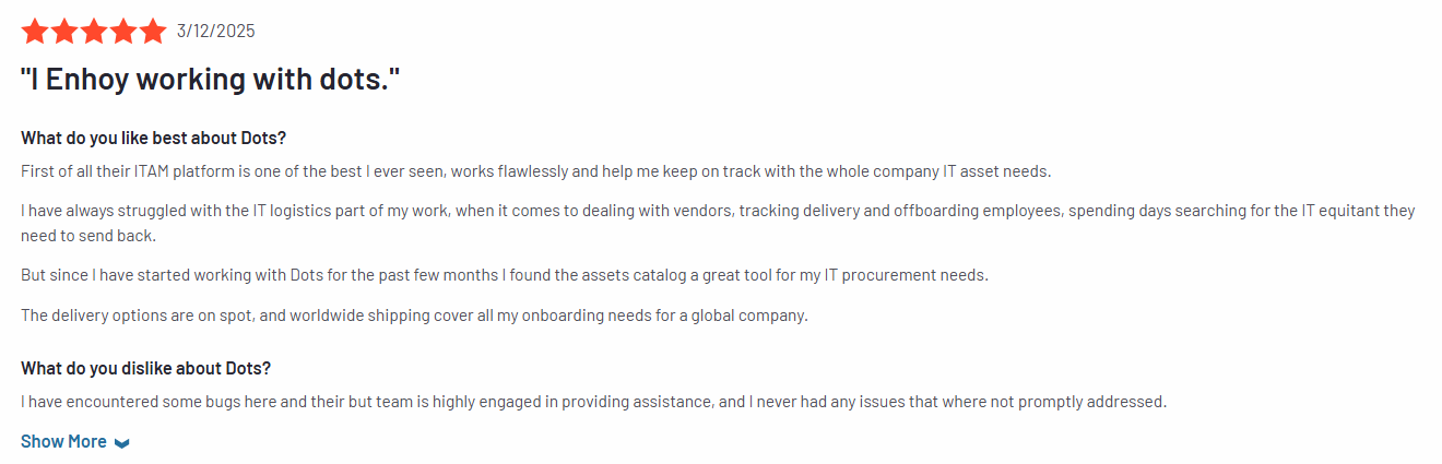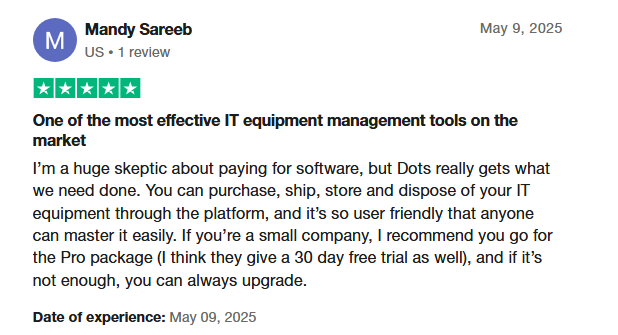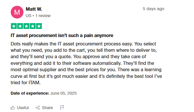 Here’s a recent review from a user on TrustPilot that highlights Dots’ ability to make the IT procurement process easier: