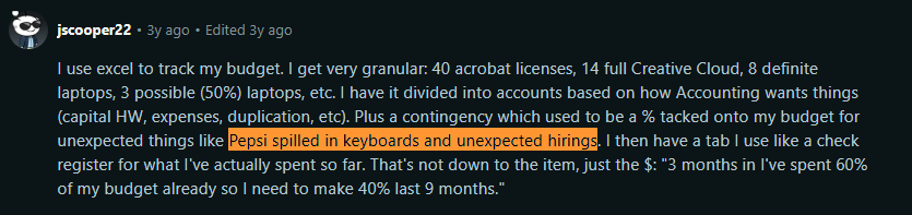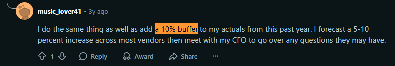Many IT managers allocate roughly 5-10% of the budget as a contingency line. In a Reddit discussion, an IT guy mentioned he routinely adds a 10% buffer on top of his forecasted costs to handle vendor price increases or surprise expenses: