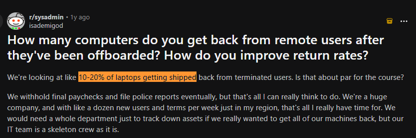 This system admin on Reddit says they retrieve just 10-20% laptops from terminated users, which is a massive financial blow. That’s because you’d have to purchase new devices for new hires rather than reassigning the ones you've retrieved.