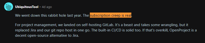 Here’s a Reddit user confirming SaaS creep is a real issue and talks about exploring self-hosted options: