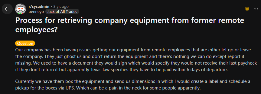 Here’s a Reddit user sharing their frustration with former remote employees not returning the equipment and ghosting them, and there’s nothing much they can do: