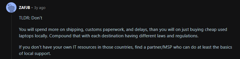 Here’s a Reddit user who mentions the challenges of shipping assets internationally (high costs of customs paperwork, delays, laws varying with locations):