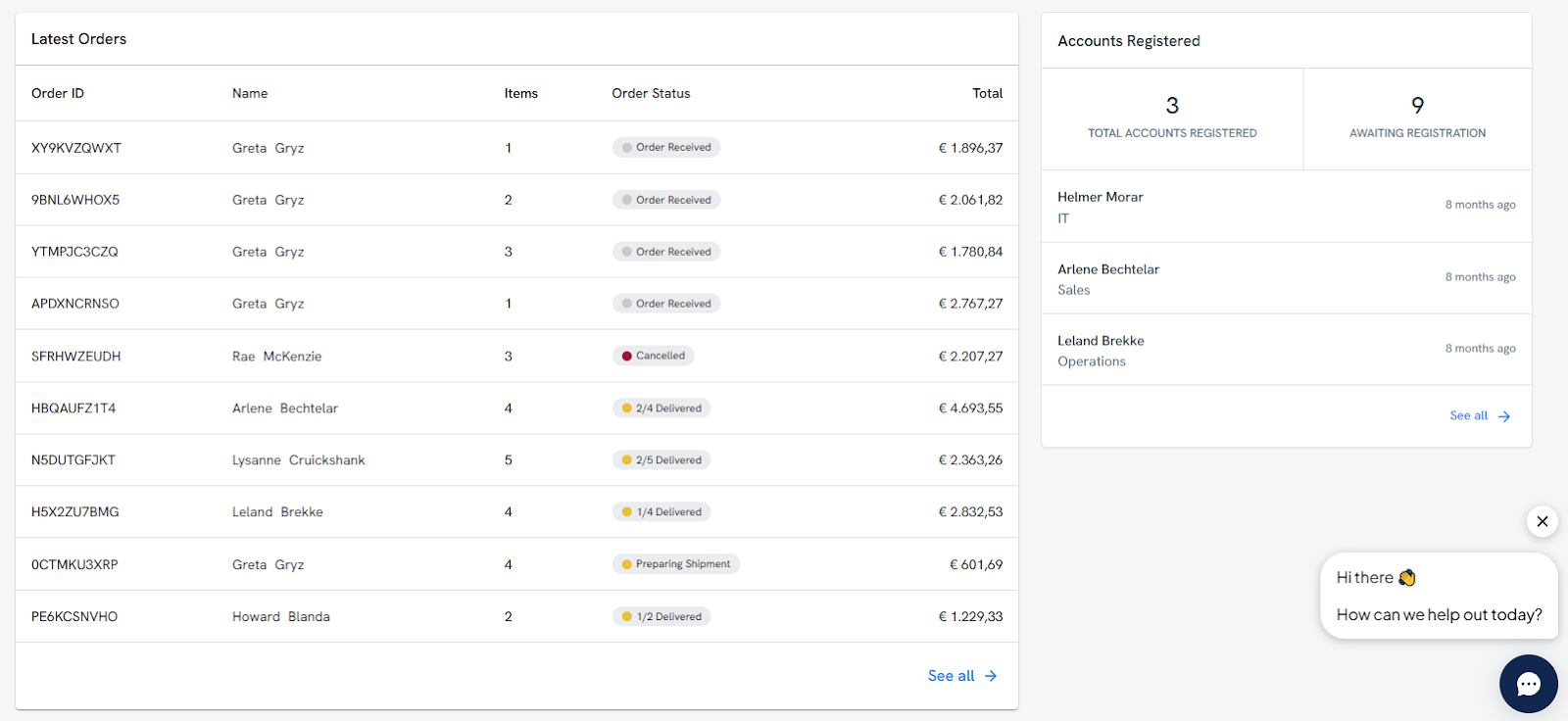 Here’s another screenshot of the same dashboard scrolled down. You can see who placed the order, how many items were ordered, the order or offboarding status, and more.