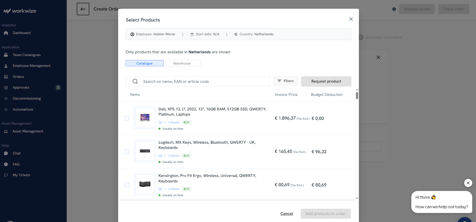 After that, the IT manager can select the products from the approved catalogue or the warehouse: