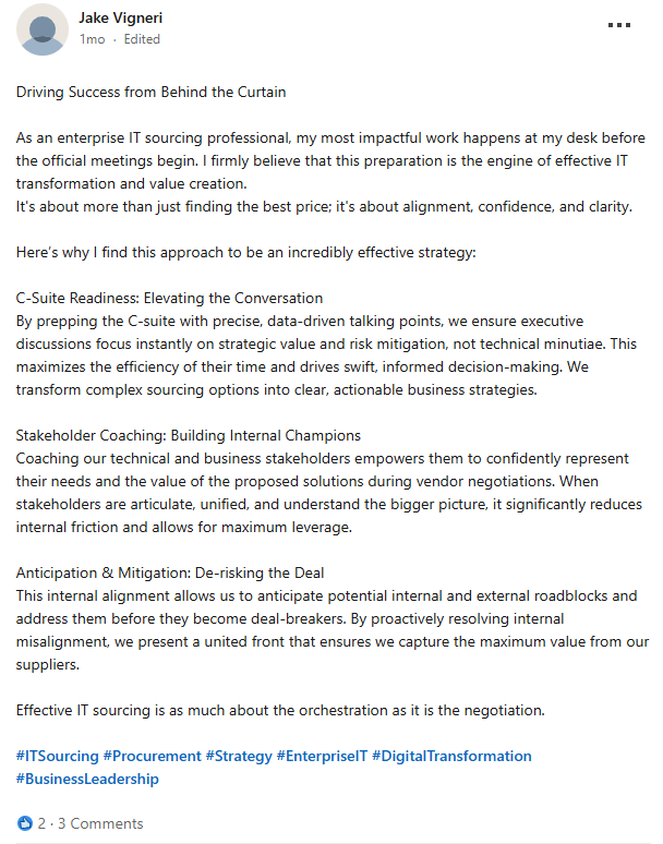On LinkedIn, Jake Vigneri also makes this point regarding stakeholder alignment. He says that it’s important to be prepared before a C-suite meeting. It helps you align stakeholders more effectively and bring everyone to the same page for faster procurement decisions.