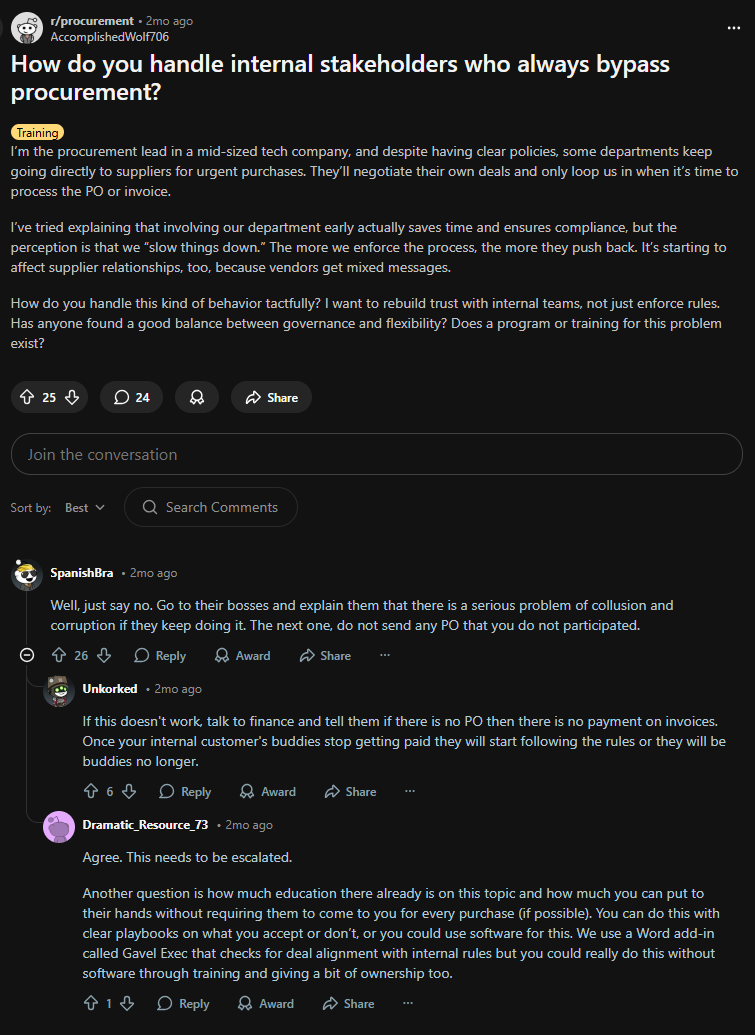 Expect healthy skepticism. Many IT and procurement folks won’t trust AI until they see real results in areas like spend cleanup and contract review (people on Reddit are vocal about this). Treat that skepticism as a good thing; it keeps your process honest.