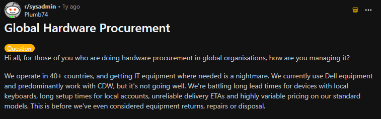 Hardware procurement is an even bigger problem entirely. It's physical, logistical and global. Here, you're dealing with suppliers across regions, customs and local tax obligations that vary by country. This can cause many hurdles in getting fully-configured devices to your employees, on time.
