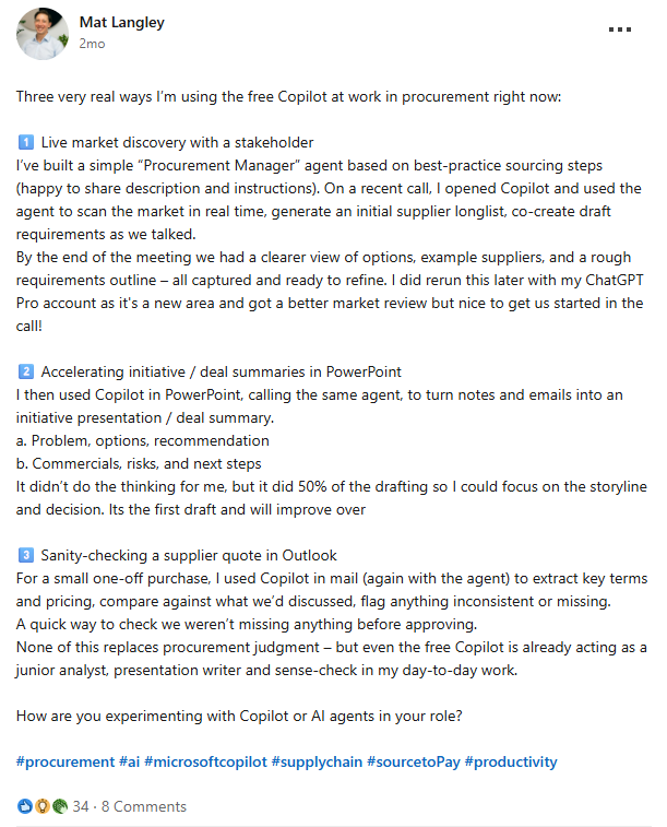 Many procurement teams are already doing this. Procurement expert Mat Langley has shared that he uses Microsoft Copilot during live conversations to scan the market and build a first list of suppliers and only then does he draft requirements in real time.