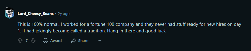 Here’s a Reddit user jokingly mentioning how common it is for companies not to have stuff (assets) ready for new hires on day 1. While this may be common, it leads to poor onboarding experiences, which in turn lead to attrition.