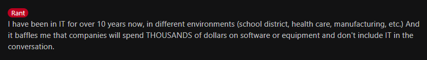 Believe it or not, procurement or other departments ordering equipment without IT's knowledge is pretty common. Here’s a Reddit user expressing their frustration with how companies spend thousands on hardware without involving IT: