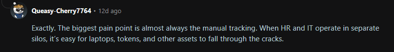 As one IT professional noted on Reddit, manual tracking and HR & IT working in silos can lead to assets falling through the cracks: