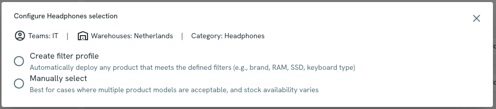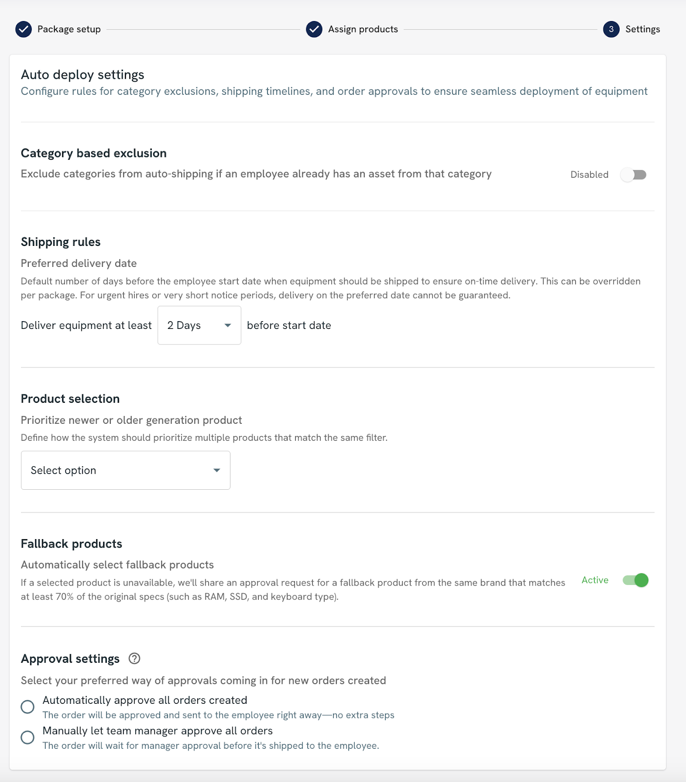 - Category-Based Exclusion: When enabled, Auto-Deploy checks the employee’s existing assets. If they already have an item in a certain category (e.g., monitor), that category is excluded from the deployment to avoid sending duplicates.