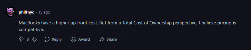Here’s a Reddit user who agrees MacBooks are costlier, but considering the TCO, they can be competitive: