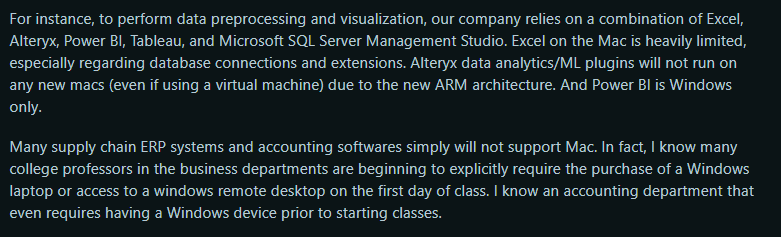 However, many businesses require software solutions that are exclusive to Windows or tailored for Windows. Here’s an example of a Reddit user whose company relies on tools like Excel, Alteryx, Power BI, Tableau, and Microsoft SQL Server Management Studio: