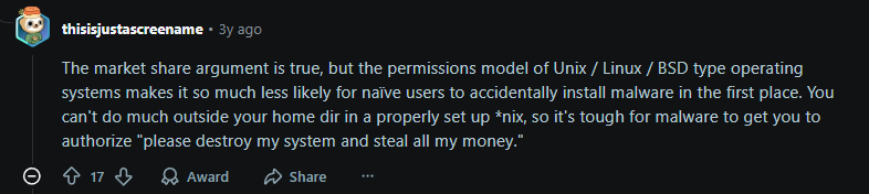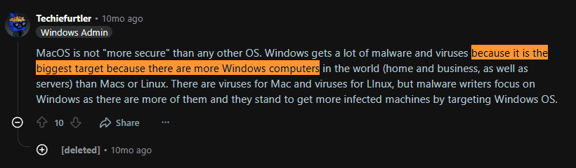 Here’s a Windows admin on Reddit sharing how Windows gets more malware attacks because of the massive market share of Windows devices: