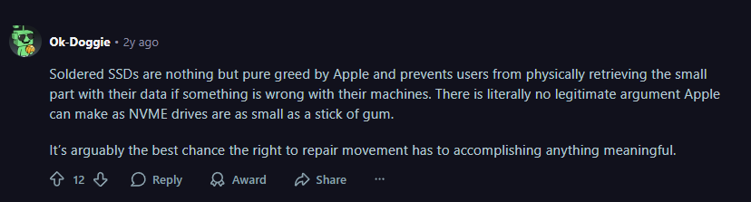 Here’s a Reddit user expressing their concern about soldered SSDs in Apple devices, making it hard to retrieve data if anything goes wrong with the machine: