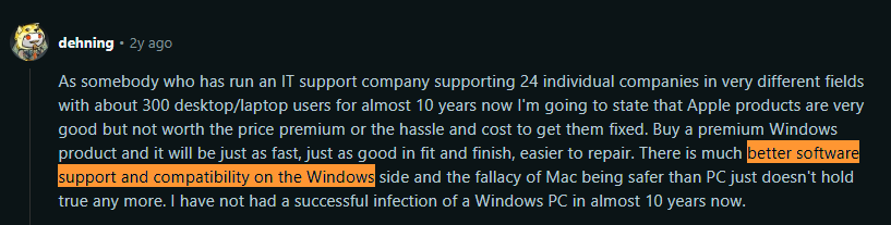 Here’s a Reddit user who runs an IT support company mentioning how Windows devices have better software compatibility and support: