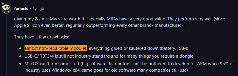 Here’s a Reddit user stating how Macs are great devices but come with non-repairable modules: