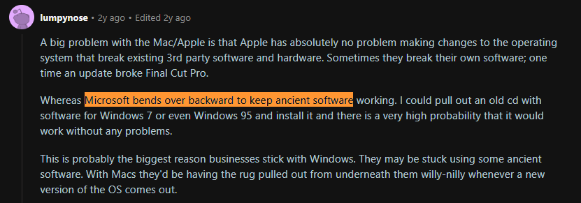 Here’s a Reddit user talking about how Microsoft's backward compatibility is one of the reasons businesses stick with Windows: