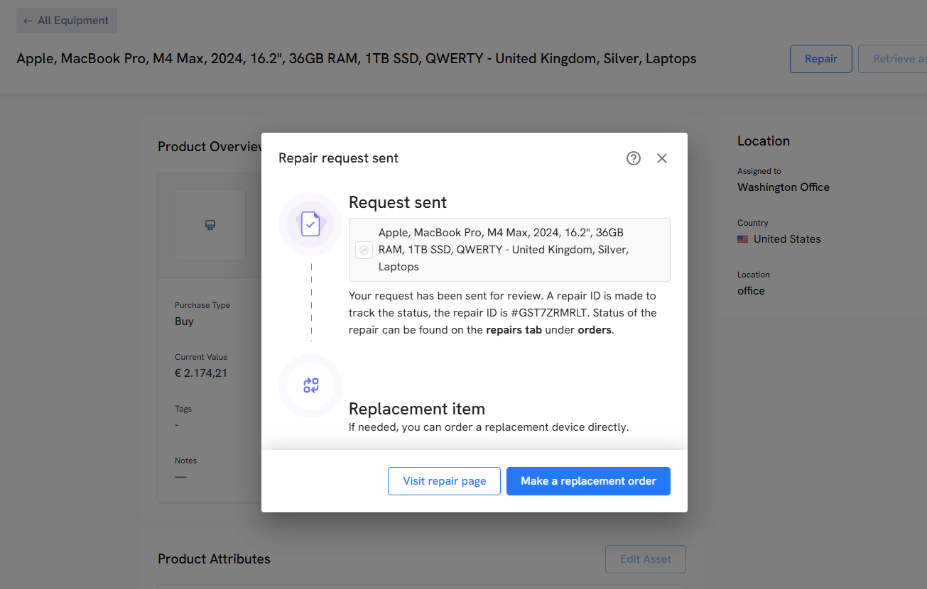 - Support & Repairs: Workwize offers services to handle repairs and maintenance. If an employee’s laptop breaks, Workwize helps facilitate a fix or provides a loaner device to minimize downtime. For Macs, this might mean leveraging Apple’s repair channels; for PCs, using local partners: Workwize coordinates it so IT doesn’t have to. You can track the repair status right in the platform.