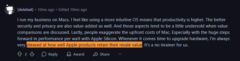 - Resale Value: Although Apple devices have a higher upfront cost, they age gracefully, unlike Windows devices, which tend to slow down over time. As a result, Apple devices have a higher resale value than Windows devices. Here’s a Reddit user mentioning how well Apple devices retain their value, making them a no-brainer choice for them: