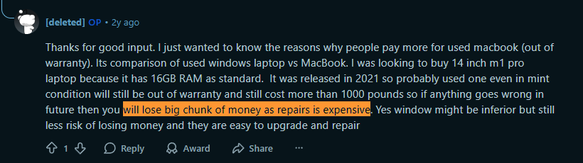 Even this Reddit user also mentions that while old MacBooks function well and have a great resale value, they can cost you a lot for out-of-warranty repairs: