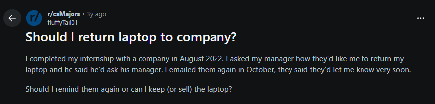 In another Reddit example, a departing employee wasn’t sure whether he should remind the manager about returning the company’s laptop or keep it (or even sell it), because of miscommunication: