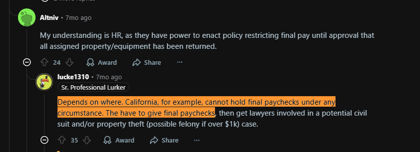 In a Reddit thread asking what actually works for getting laptops back, a system administrator responded bluntly that it’s an HR responsibility and another user immediately agreed.