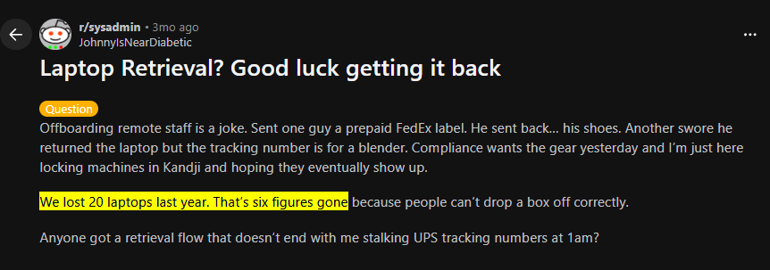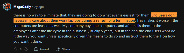 One Reddit user summed it up bluntly: end users don’t necessarily care about their work laptops during refresh or termination: