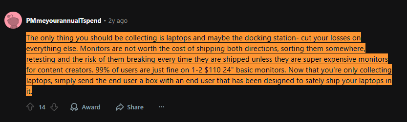 For instance, this Reddit user recommends collecting laptops and maybe the docking station, and ignoring monitors (unless they’re super expensive) and peripherals. Since most users are fine with basic monitors, shipping them back might lead to a negative ROI, considering the cost of shipping and the risk of breaking the monitor midway: