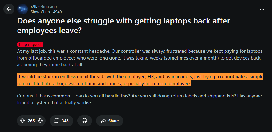 Without an automated asset management solution, your IT team would end up spending hours chasing returns, emailing employees, sharing updates and whatnot. This user on Reddit shared how their IT team used to get stuck in endless email threads for tracking returns, resulting in wasted time and money: