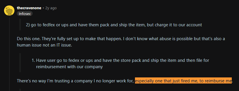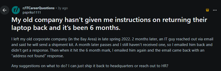 For instance, companies sometimes fail to communicate well with departing employees about how and when to return their devices. This Reddit user shared that the only communication he received was from the IT department that he'll get a shipment kit, and then everything went silent. Six months later, he still had the laptop at home.