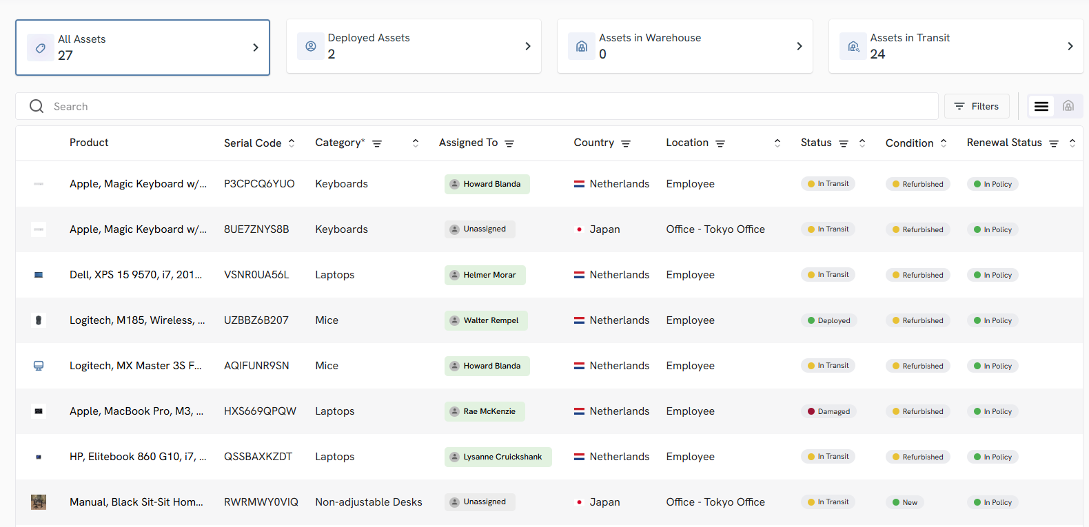 And you can see the product name, serial code, who it’s assigned to, its location, status, condition, and renewal status—all in real-time.