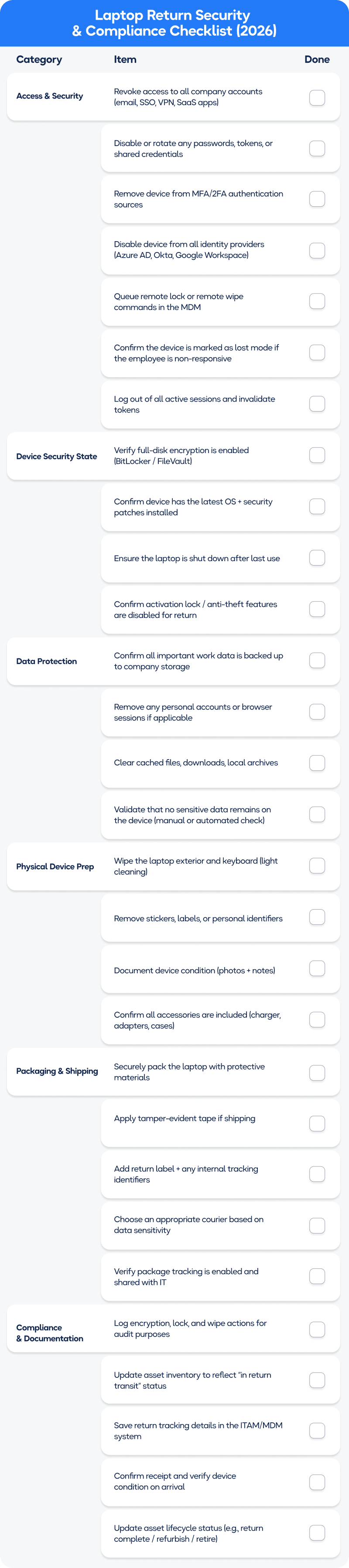 This checklist standardizes the security steps IT must complete before a device leaves the employee’s hands, reducing the risk of data exposure during transit.