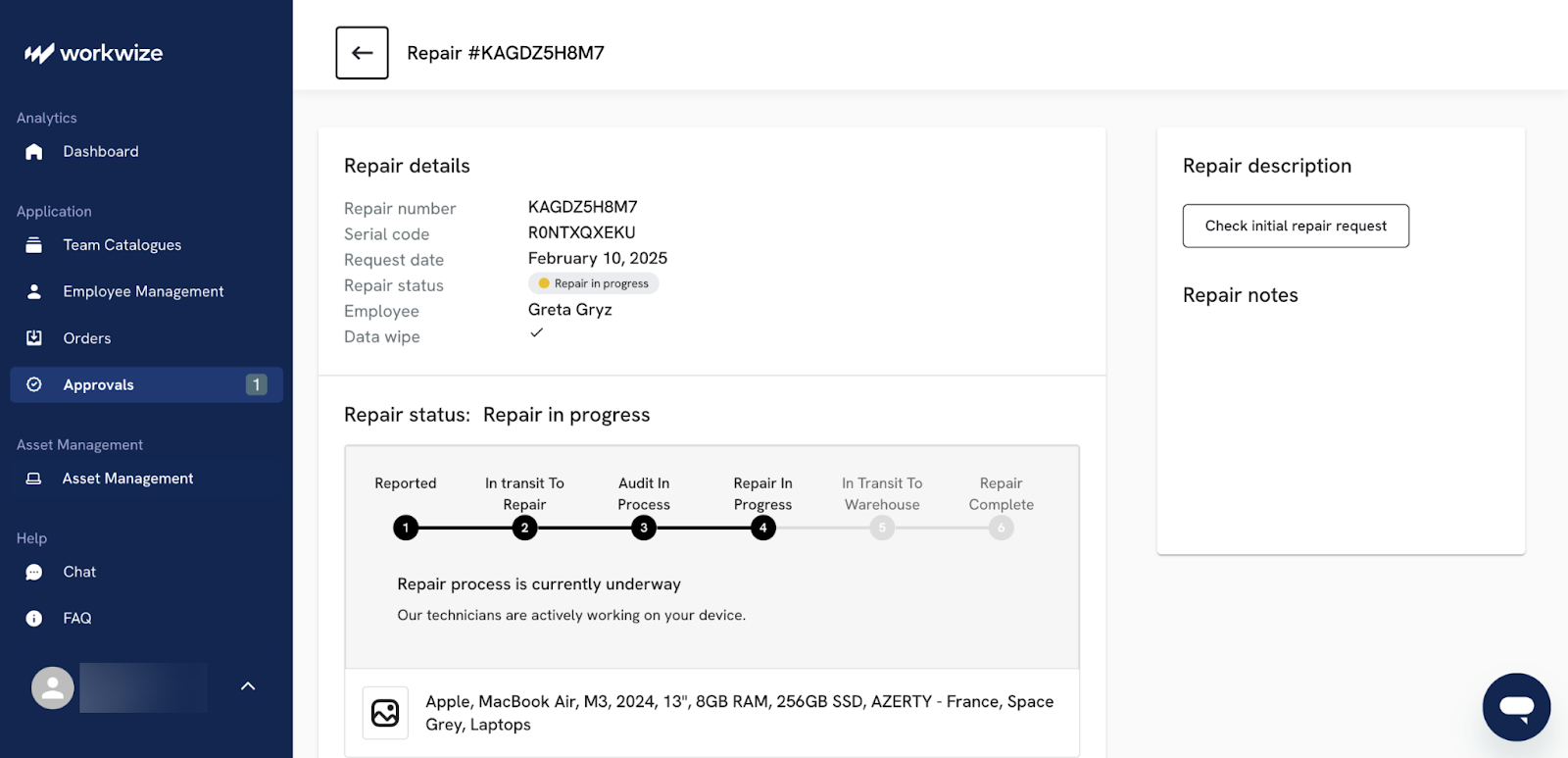 With Workwize, this process becomes much easier. Employees can raise repair requests themselves through a self-service portal, and the right workflow is triggered automatically, so devices get fixed without IT chasing tickets.